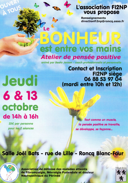Tout comme le piano, une langue, un muscle, la pensée positive se travaille ! Dans mes ateliers je vous propose de découvrir des exercices simples et pratiques qui vous aident à aborder la vie quotidienne avec plus de sérénité et à transformer vos émotions négatives en énergie positive.